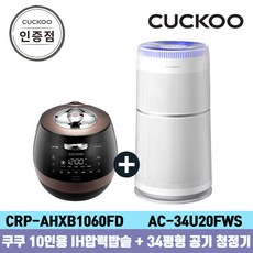 필수 표기정보 품명 및 모델명 품명:쿠쿠 CRP-AHXB1060FB+AC-34U20FWS IH압력밥솥 공기청정기 패키지 공식판매점 SJ / 모델명:CRP-AHXB1060FB+AC-34U20FWS KC 인증 필 유무 인증유형:전기용품안전인증(KCC) / 인증번호:KS 제 3752 호/ 전자파…
