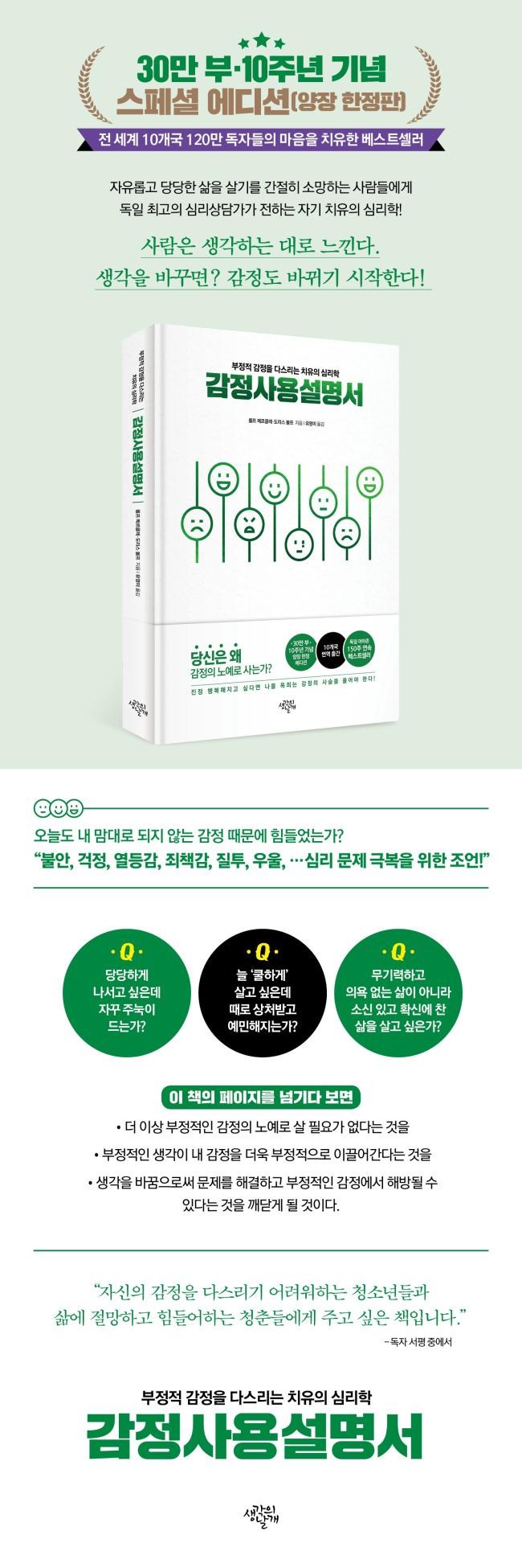 | 도서명 | [생각의날개]감정사용설명서 : 부정적 감정을 다스리는 치유의 심리학 (10주년 기념 스페셜 에디션 양장) |