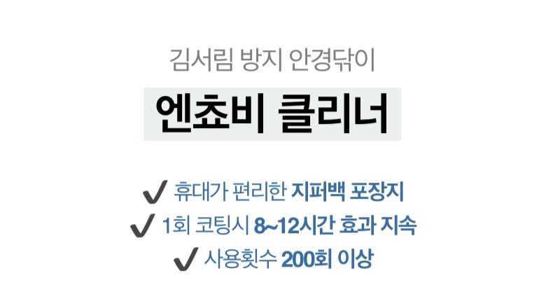 필수 표기정보 품목 및 제품명 엔쵸비 안티포그 안경닦이 용도(표백제의 경우 계열을 함께표시) 및 제형 특수목적코팅제, 김서림 방지용, 티슈형 제조연월 및 유통기한(해당 없는 제품 생략 가능)…
