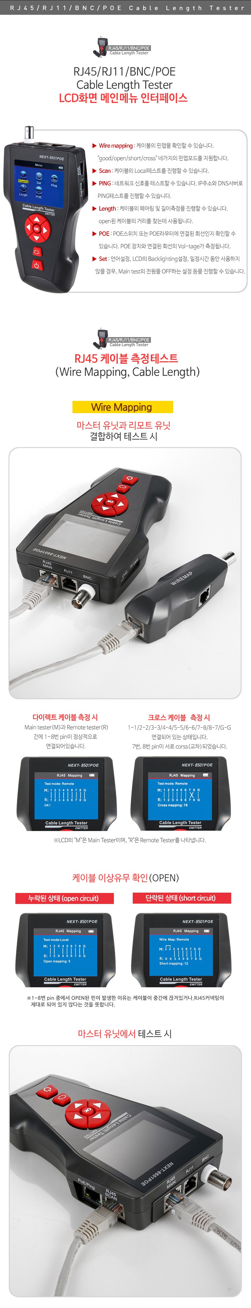 | 주요 사양 | 랜테스터기 POE 전압체크,인터넷회선상태 체크(Ping test),LRJ45,RJ11,BNC동축케이블 테스터기 / PIN Map,케이블 길이체크 / 전문가용 케이블 테스터기 / LCD지원 |