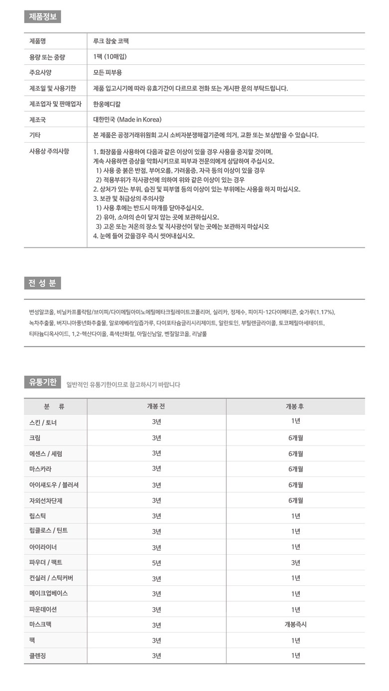 필수 표기정보 용량(중량) 0.5g x 10매 제품 주요 사양 모든피부 사용기한 또는 개봉 후 사용기간 개봉 후 사용기간의 경우 제조연월일 병행표기 사용방법 상품 상세페이지 참조…