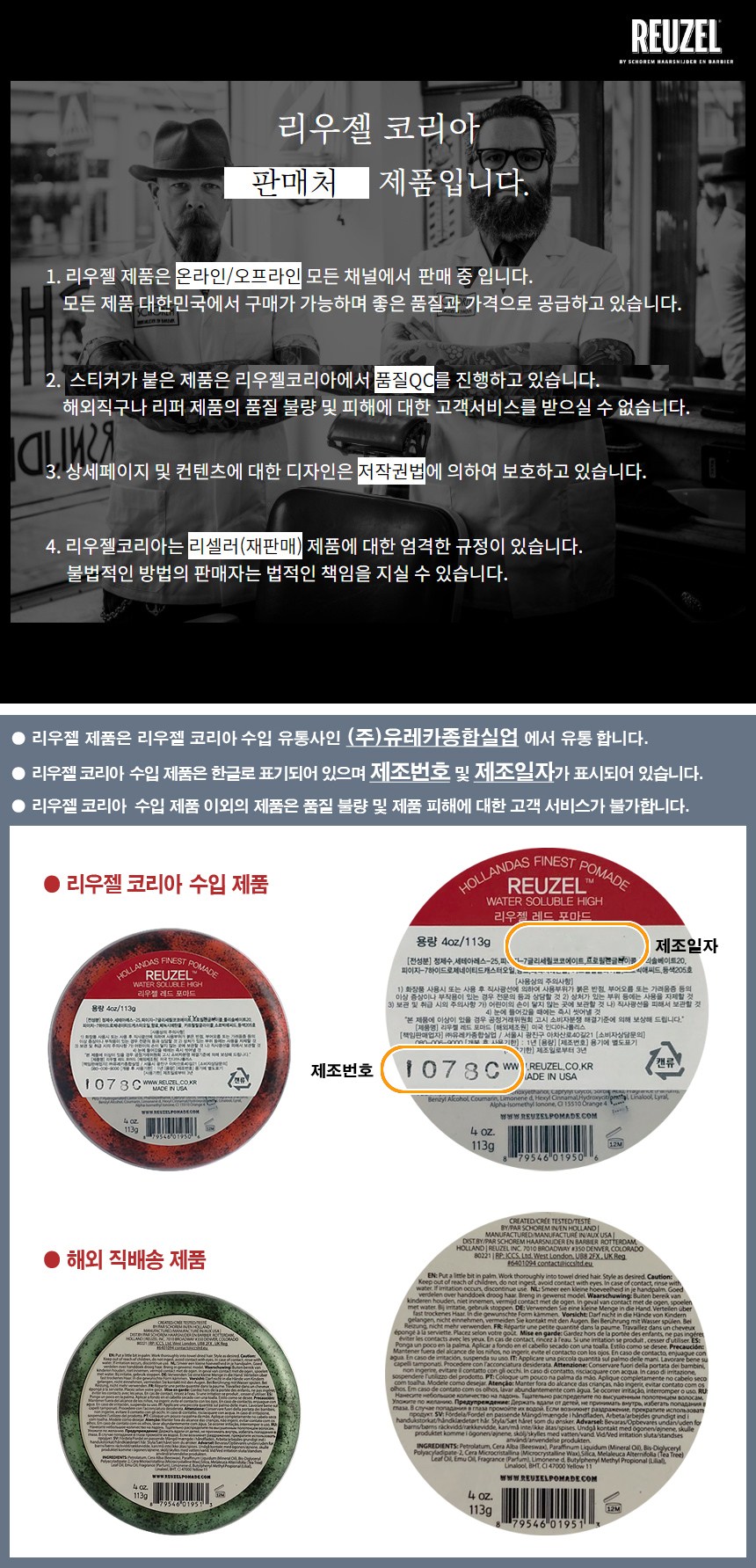 | 화장품제조업자 및 화장품책임판매업자 | REUZEL INC / (주)유레카종합실업 |