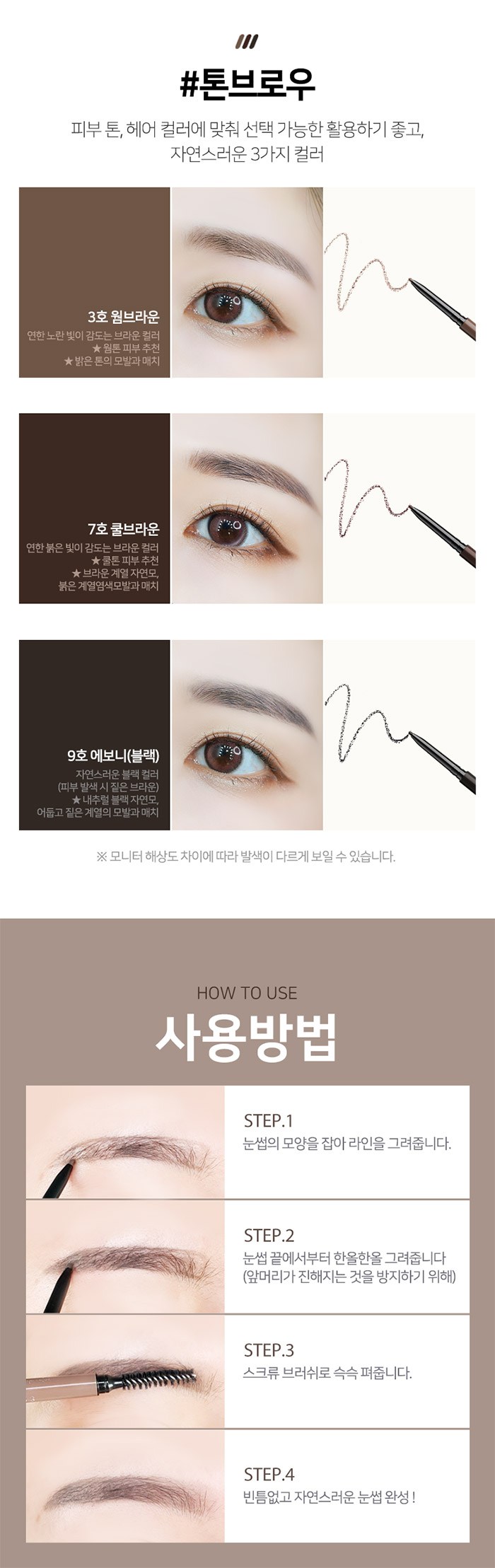| 사용방법 | 자신의 머리색에 맞추어 컬러를 선택하여 눈썹머리부터 꼬리까지 원하는 모양으로 그려줍니다. |