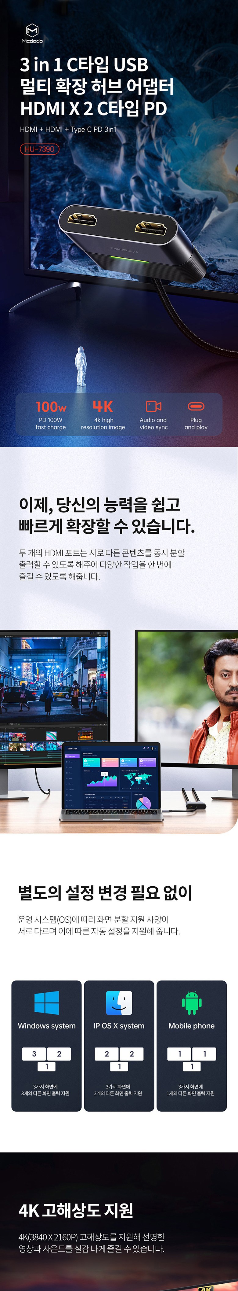 | 품명 및 모델명 | 3 in 1 C타입 USB 멀티 확장 허브 어댑터 HDMI X 2 C타입 PD / HU-7390 |