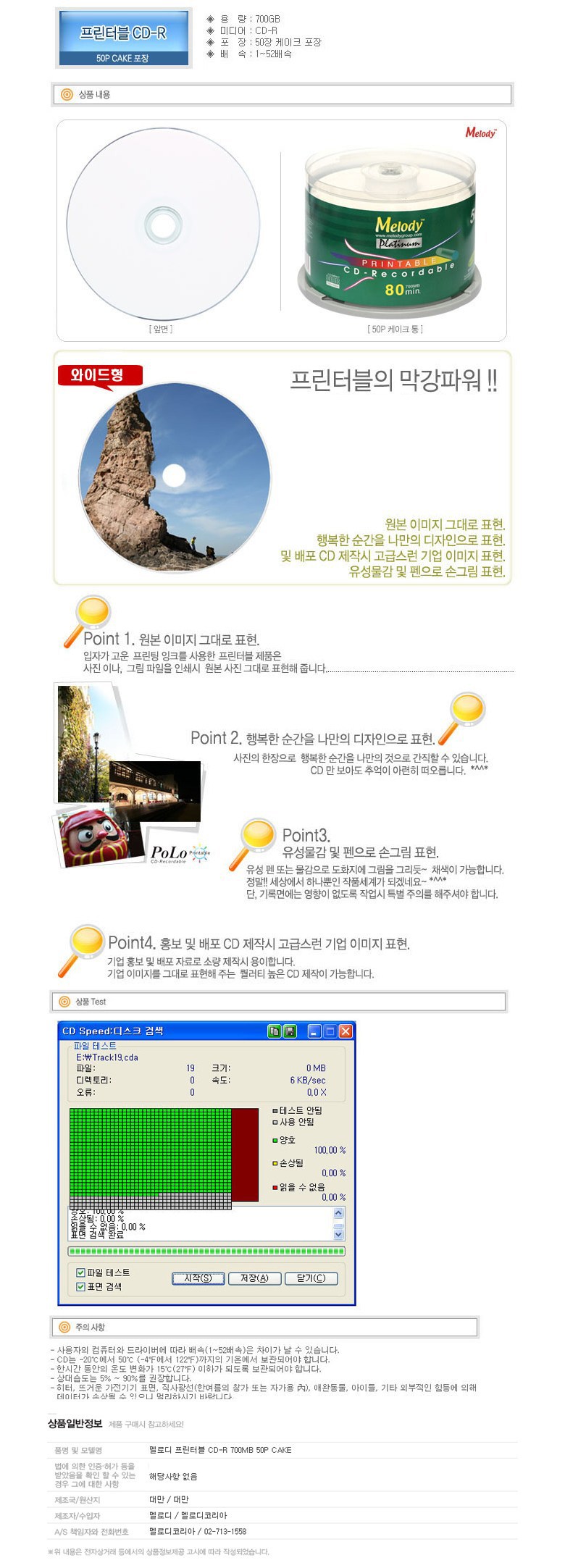 | 품명 및 모델명 | 멜로디 CD-R 700M 52X 프린터블 50P CAKE, 단일상품 |