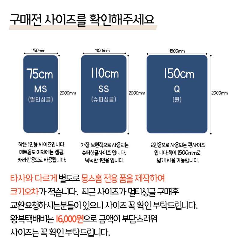 | 치수 | 멀티싱글(75×200),슈퍼싱글(110×200),퀸(150×200) |