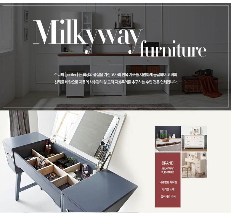| 크기 | 콘솔: 가로1200x세로450x높이730(mm)2단서랍장:가로600x세로450x높이550거울:가로1000x세로100x높이600 |