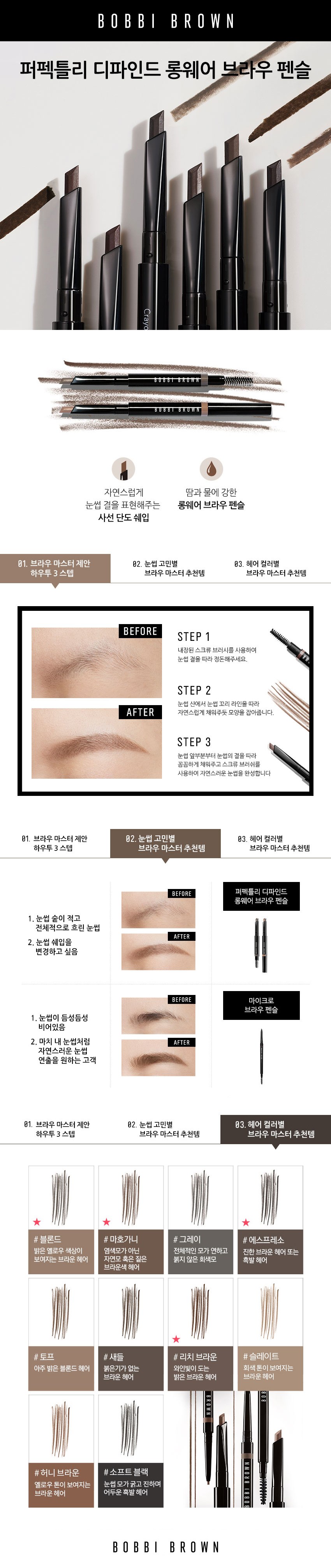 | 사용방법 | 가벼운 짧은 터치로 눈썹 모양을 바르게 잡고 채워주세요. 트위저를 사용하면 보다 쉽게 눈썹 모양을 다듬을 수 있습니다. 그 후 스폴리 브러쉬로 눈썹을 부드럽게 빗어 정리하고, 사선 형태로 기울어진 브라우 펜슬로 눈썹을 쉐이딩 하듯 그려주세요. 마무리 단계로 펜셀의 뾰족한 끝 부분으로 눈썹 꼬리 모양을 그리면 완성입니다. |