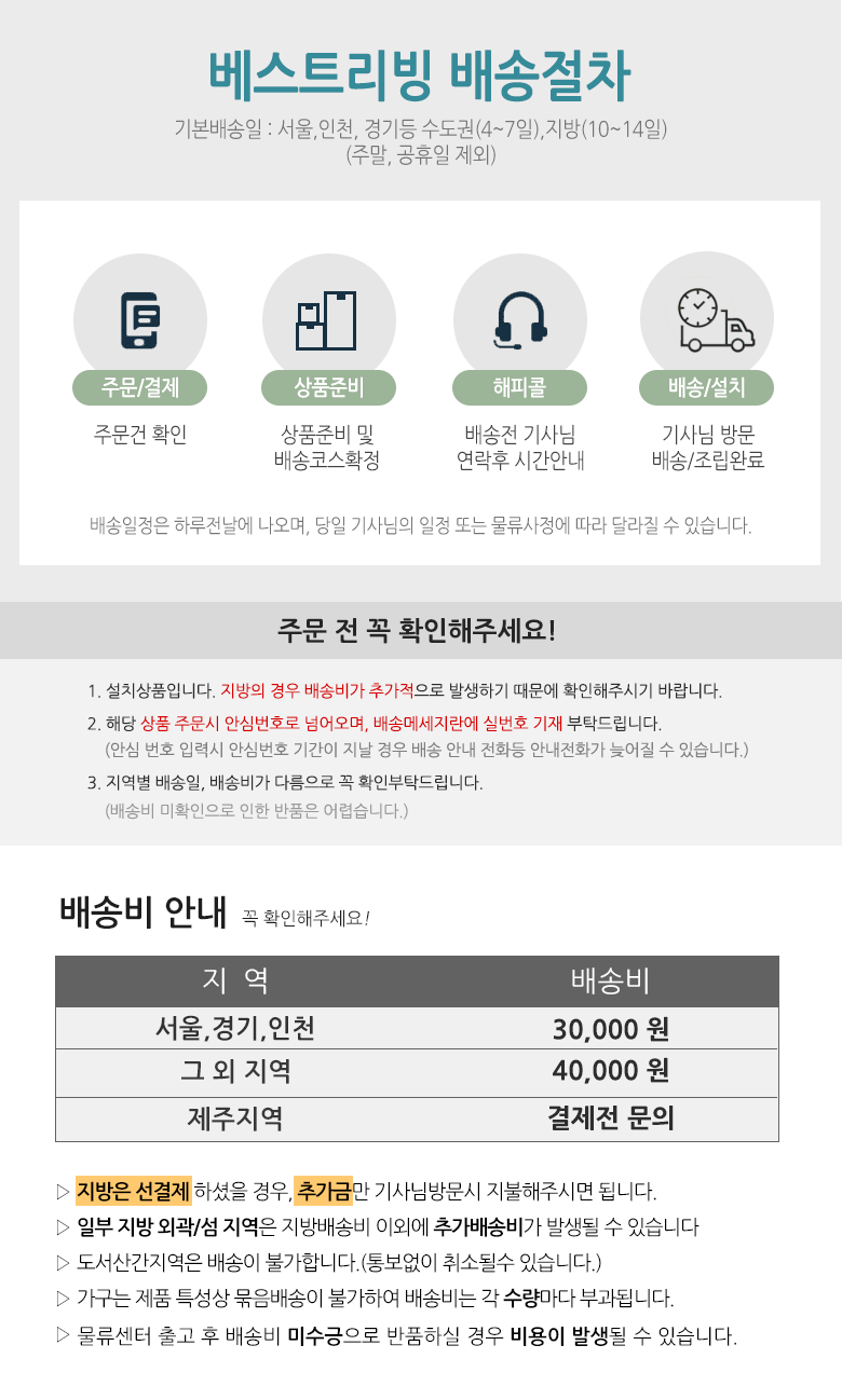| 배송/설치비용 | 기사님 직배송/설치상품/주문확인후 주말, 공휴일 제외 수도권 4~7일 지방 10~14일 소요됨/수도권 3만원, 지방4만원 배송비 발생 |