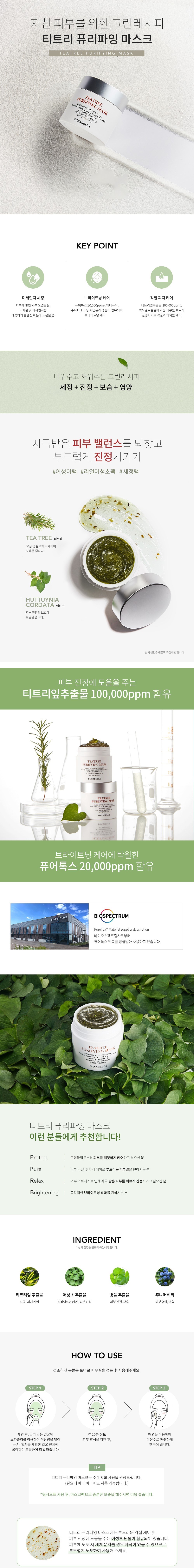 | 화장품법에 따라 기재, 표시하여야 하는 모든 성분 | 정제수, 글리세린, 티트리잎추출물(100,000ppm),, 메틸프로판다이올, 베타인, 1,2-헥산다이올, 프로판다이올, 두송열매추출물, 쇠비름추출물, 병풀추출물, 무화과 추출물, 알로에베라잎추출물, 인도멀구슬나무잎추출물, 인도멀구슬나무꽃추출물, 라벤더추출물, 바질꽃/잎추출물, 아이비고드열매추출물, 로즈마리잎추출물, 마 시멜로잎/뿌리추출물, 마트리카리아꽃추출물, 약모밀추출물, 회향추출물, 카카오씨추출물, 가지열매추출물, 부들레야추출물, 알로에베라꽃추출물, 타임추출물, 브 로콜리추출물, 홀리바질잎추출물, 울금뿌리추출물, 참산호말추출물, 오렌지오일, 사과수, 소듐하이알루로네이트, 필리핀오렌지껍질오일, 하이드로제네이티드레 시틴, 리씨열매오일, 폴리글리세릴-10라우레이트, 판테놀, 카보머, 트로메타민, 약모밀가루, 잔탄검, 글리세릴폴리메타크릴레이트, 다이소듐이디티에이, 바이오플 라보노이드, 덱스트린, 세라마이드엔피, 에틸헥실글리세린, 리모넨 |