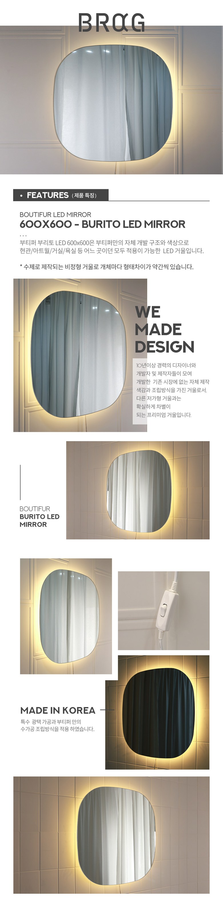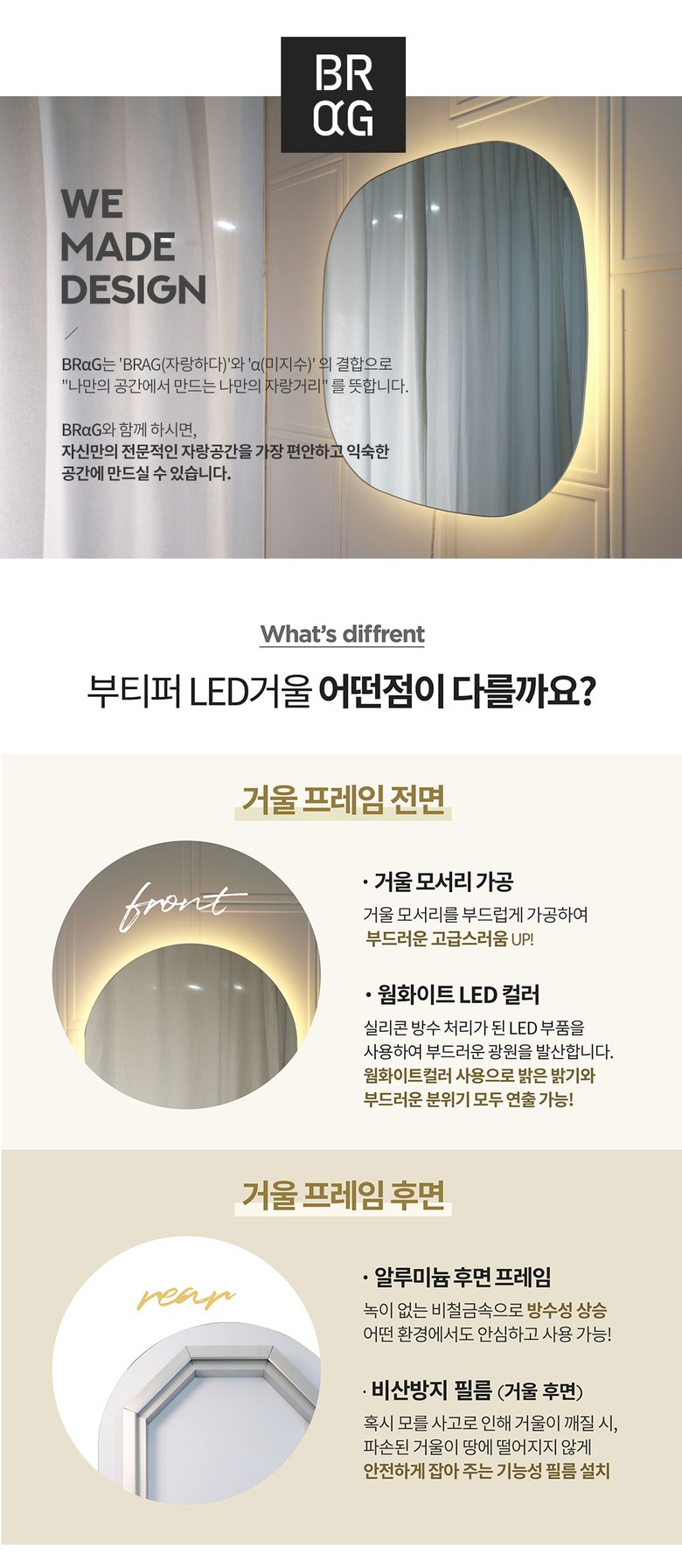 | 주요 소재 | 알루미늄 / 5T 국산 비산방지 거울 / 방수안정기, 방수LED |