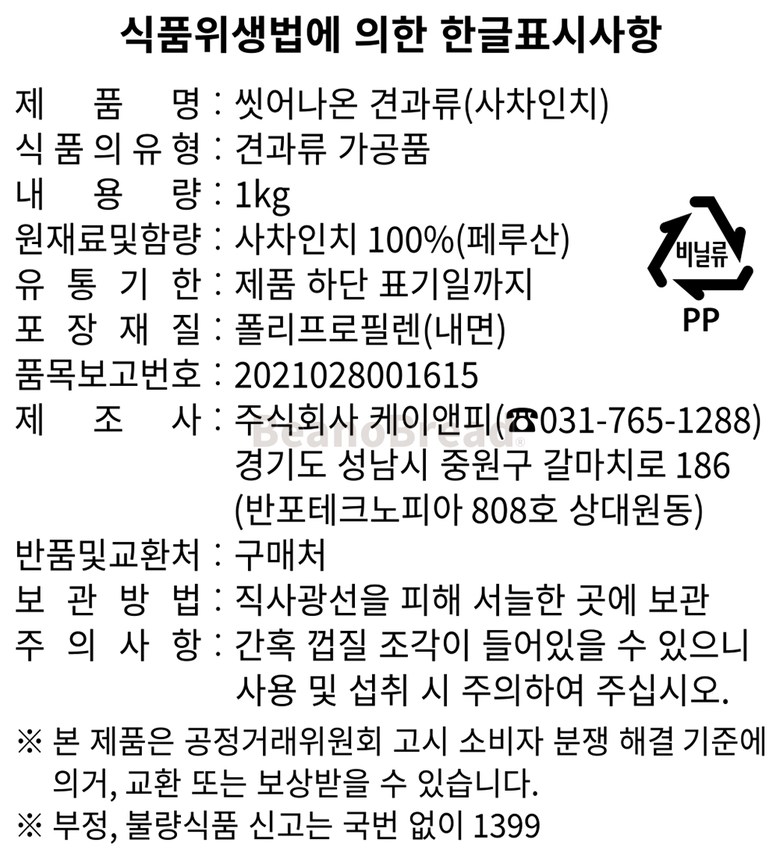 | 품목 또는 명칭 | 씻어나온 견과류 (사차인치) |