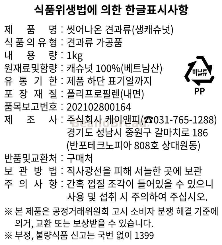 | 소비자안전을 위한 주의사항 | 간혹 껍질 조각이 들어있을 수 있으니 사용 및 섭취 시 주의하여 주십시오. |