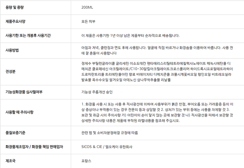 필수 표기정보 용량(중량) 상세정보참조 제품 주요 사양 상세정보참조 사용기한 또는 개봉 후 사용기간 상세정보참조 사용방법 상세정보참조 화장품제조업자 및 화장품책임판매업자 상세정보참조 제조국 상세정보참조 화장품법에 따라 기재,…