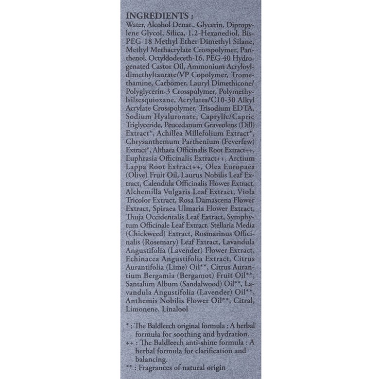 | 화장품법에 따라 기재, 표시하여야 하는 모든 성분 | 정제수, 변성알코올, 글리세린, 디프로필렌글라이콜, 실리카, 1,2-헥산디올, 비스-피이지-18메칠에텔디메칠실란, 메칠메타크릴레이트크로스폴리머, 판테놀, 옥틸도데세스-16, 피이지-40하이드로제네이티드캐스터오일, 암모늄아크릴로일디메칠타우레이트/브이피코폴리머, 트로메타민, 카보머, 라우릴디메치콘/폴리글리세린-3크로스폴리머, 폴리메칠실세스퀴옥산, 아크릴레이트/C10-30알킬아크릴레이트크로스폴리머, 트리소듐이디티에이, 소듐하이알루로네이트, 카프릴릭/카프릭트리글리세라이드, 딜추출물*, 서양톱풀추출물*, 피버퓨추출물*, 마시멜로뿌리추출물+, 아이브라이트추출물+, 우엉추출물+, 올리브오일, 월계수잎추출물, 카렌둘라꽃추출물, 성모초잎추출물, 삼색제비꽃추출물, 다마스크장미꽃추출물, 매도우스위트꽃추출물, 서양측백나무잎추출물, 컴프리잎추출물, 별꽃추출물, 로즈마리잎추출물, 라벤더꽃추출물, 에키나세아추출물, 라임오일**, 베르가모트열매오일**, 백단향오일**, 라벤더오일**, 캐모마일꽃오일** |