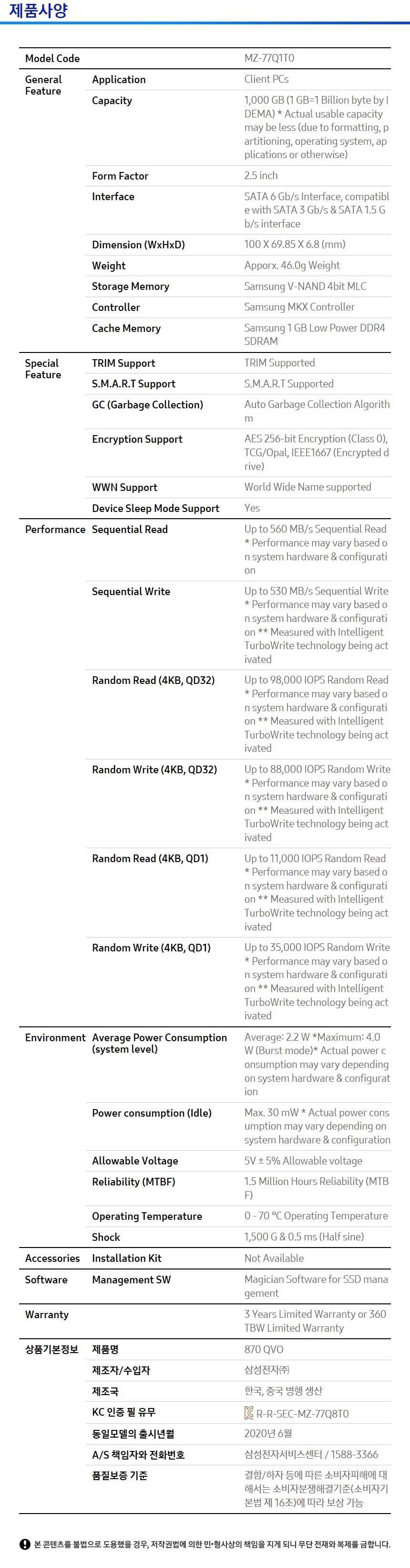 필수 표기정보 품명 및 모델명 MZ-V8P1T0BW / 인증모델명: MZ-V8P1T0 KC 인증 필 유무 R-R-SEC-MZ-V8P1T0 정격전압, 소비전력 해당없음 출시년월 2020. 09 제조자(수입자) 삼성전자(주) / 알 수…