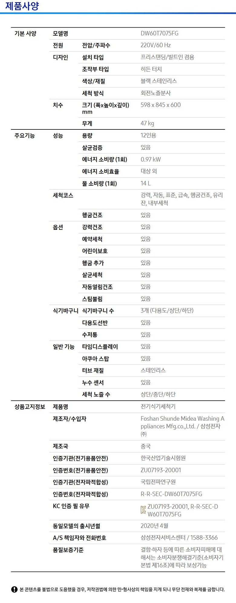 | A/S 책임자와 전화번호 | 상품 상세페이지 참조 |