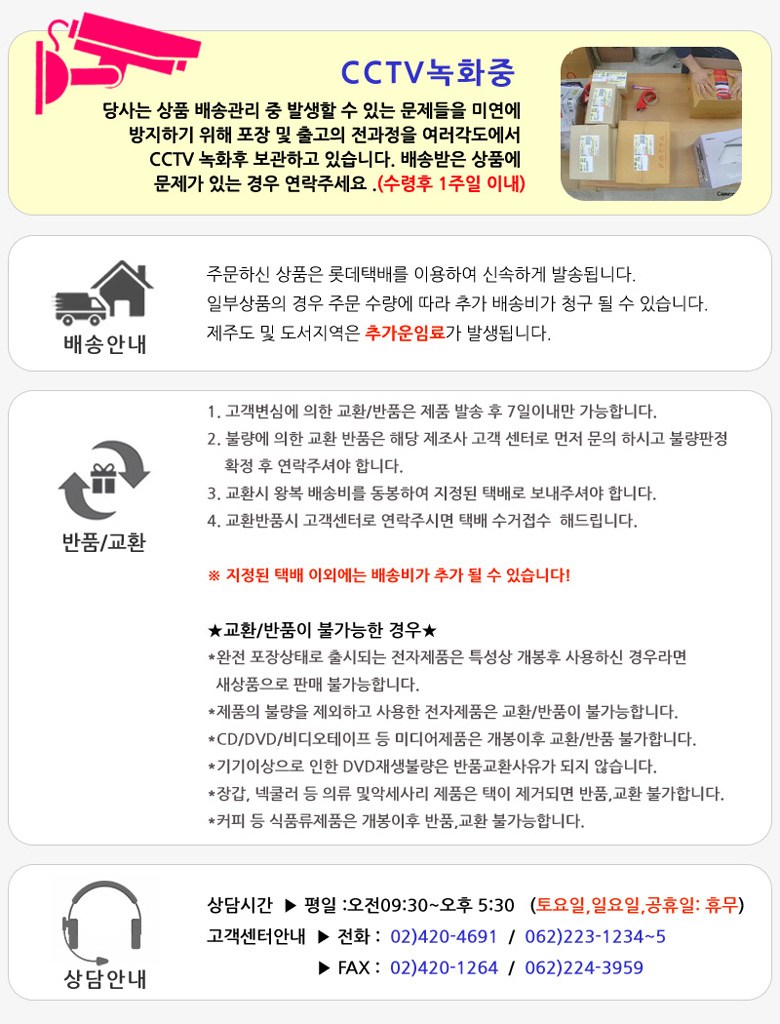 필수 표기정보 품명 및 모델명 상세페이지 참조 인증/허가 사항 해당사항없음 제조국(원산지) 상세페이지 참조 제조자(수입자) 상세페이지 참조 소비자상담 관련 전화번호 상세페이지 참조 관련