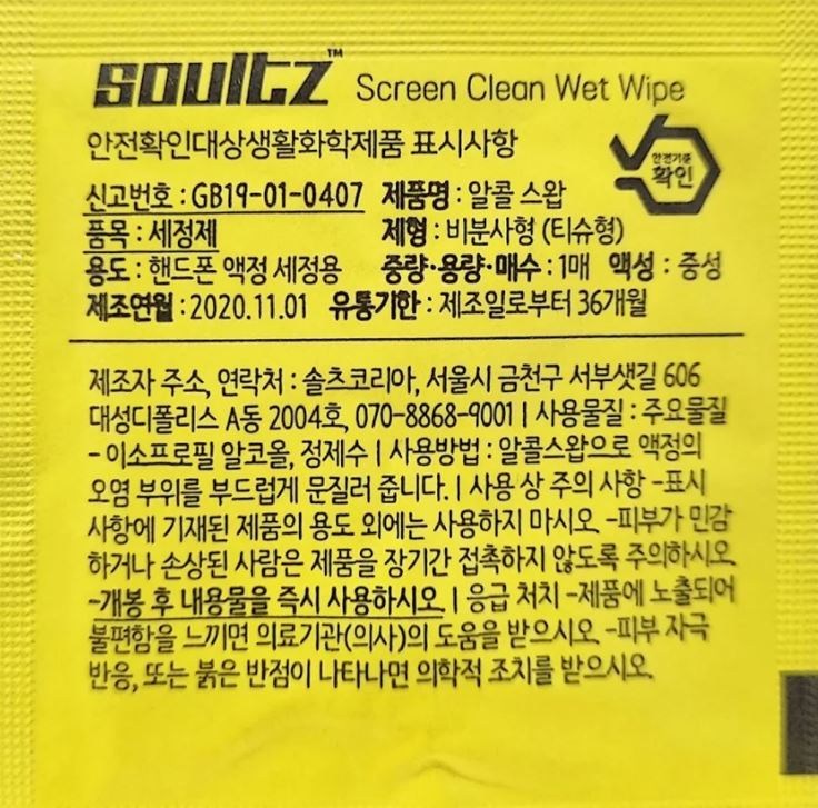 | 용도(표백제의 경우 계열을 함께표시) 및 제형 | 핸드폰 액정 세정용 / 비분사형 (티슈형) |