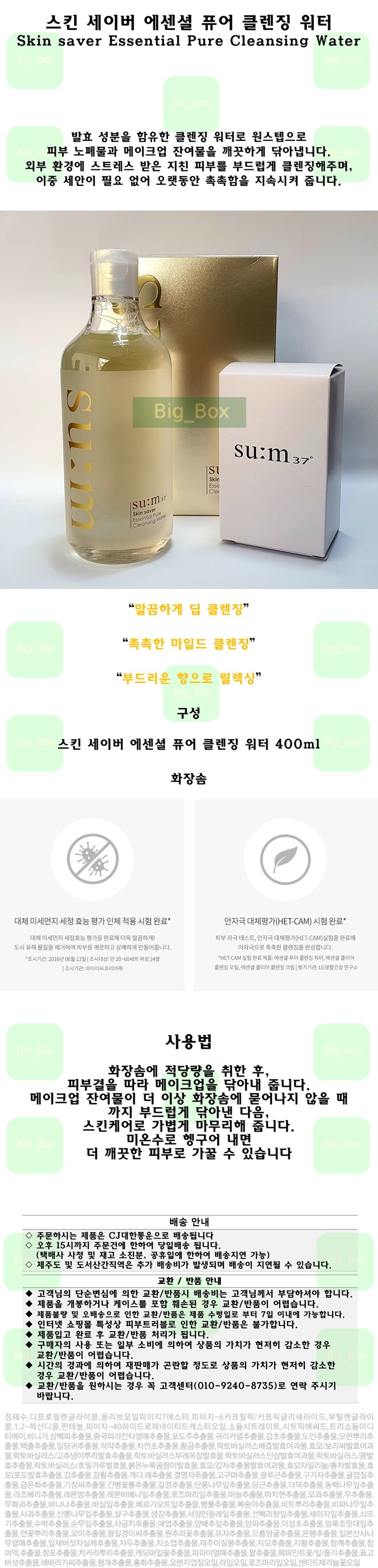 필수 표기정보 용량(중량) 300ml 제품 주요 사양 모든 피부용 사용기한 또는 개봉 후 사용기간 추후 업데이트 예정 사용방법 컨텐츠참조 화장품제조업자 및 화장품책임판매업자 서울화장품/더샘인터내셔날 제조국 한국…