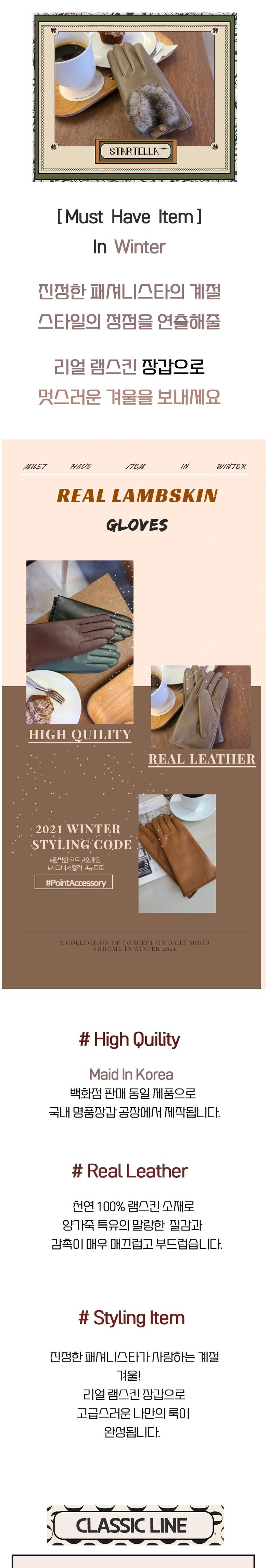 | 취급시 주의사항 | 장갑이 젖었을 때에는 직사광선 또는 불로 건조시키지 말고 부드러운 천으로 잘 닦아 주십시오. 오염되었을 때는 가죽전용 크림이나 콜드크림으로 세척하시고 일반 세척제나 벤졸은 절대로 사용하시지 마십시오. 보관시에는 온도나 습도가 높은 곳은 피하십시오. |