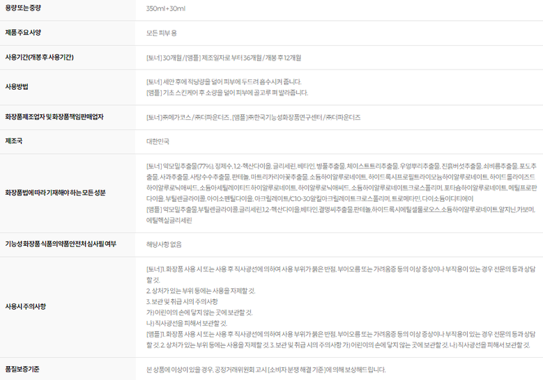 필수 표기정보 용량(중량) 상품 상세페이지 참조 제품 주요 사양 상품 상세페이지 참조 사용기한 또는 개봉 후 사용기간 상품 상세페이지 참조 사용방법 상품 상세페이지 참조 화장품제조업자…