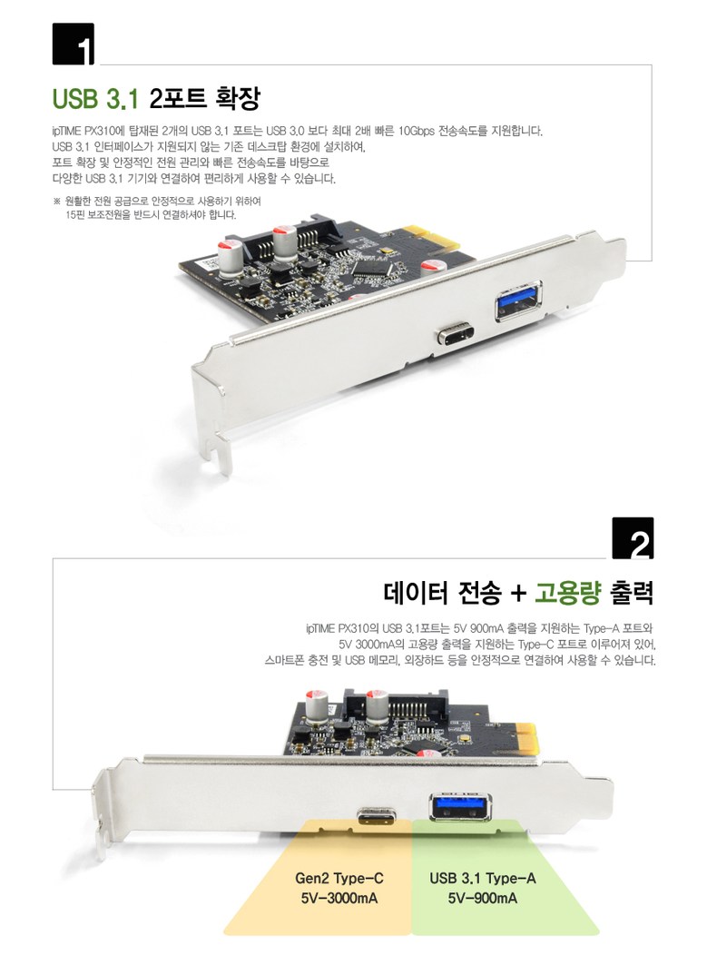 | 주요 사양 | PCI-Express to USB 3.1 확장카드 / Type-C 1개 + Type-A 1개 |