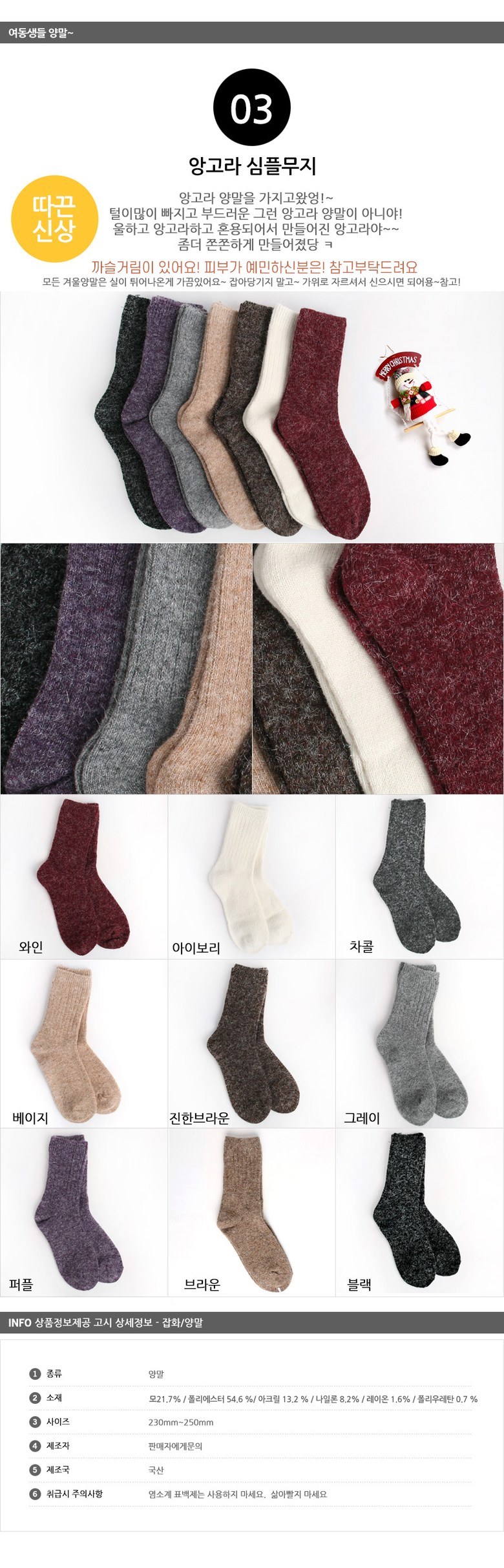필수 표기정보 종류 발목양말 소재 컨텐츠참조 치수 250~280mm 제조자(수입자) 라온 제조국 대한민국 취급시 주의사항 손빨래를 권장합니다.뜨거운 물에 삶아 세탁하지 마십시오 품질보증기준 제품 이상 시 공정거래위원회…