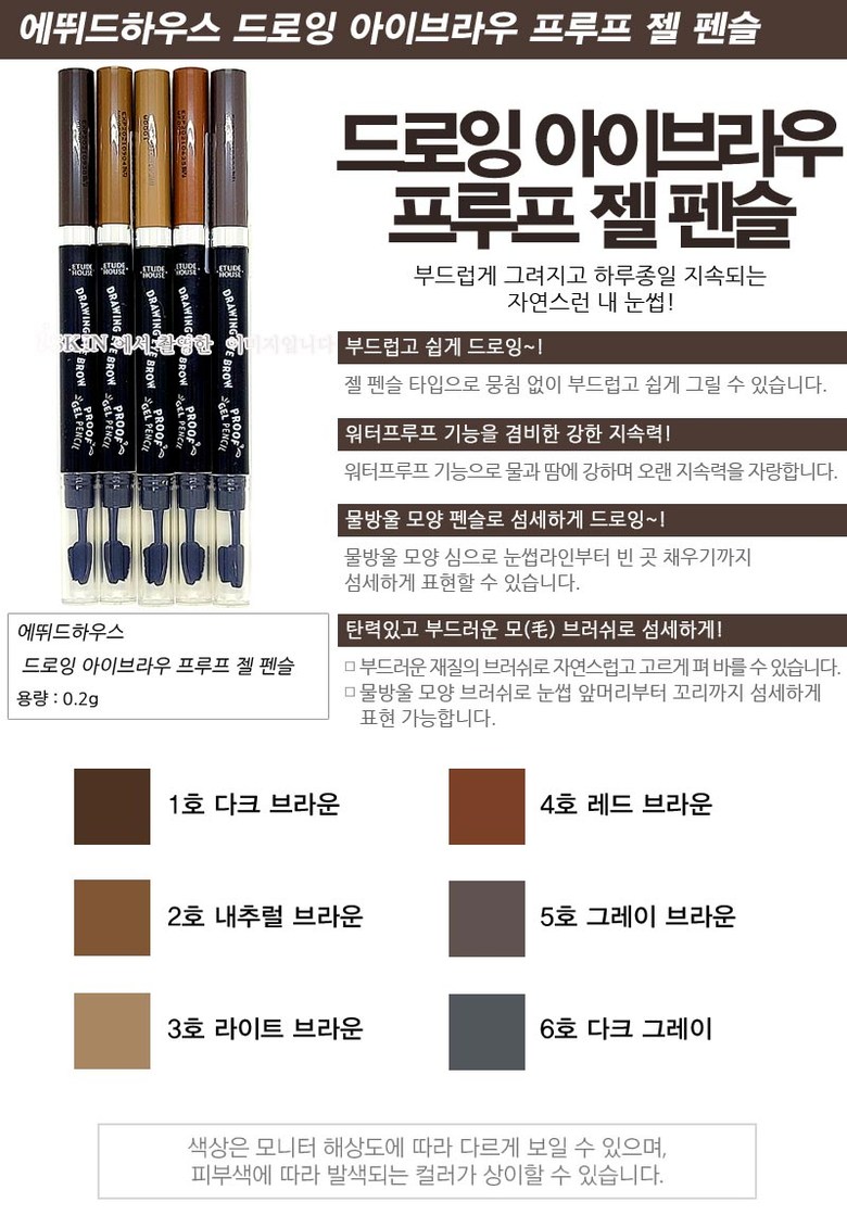 필수 표기정보 용량(중량) 0.5g 제품 주요 사양 모든피부용 사용기한 또는 개봉 후 사용기간 출고일기준1년이내제조/개봉전3년/개봉후1년 사용방법 눈썹 앞머리는 아래에서 위로 눈썹이 나 있는 방향을 따라 그려줍니다.…