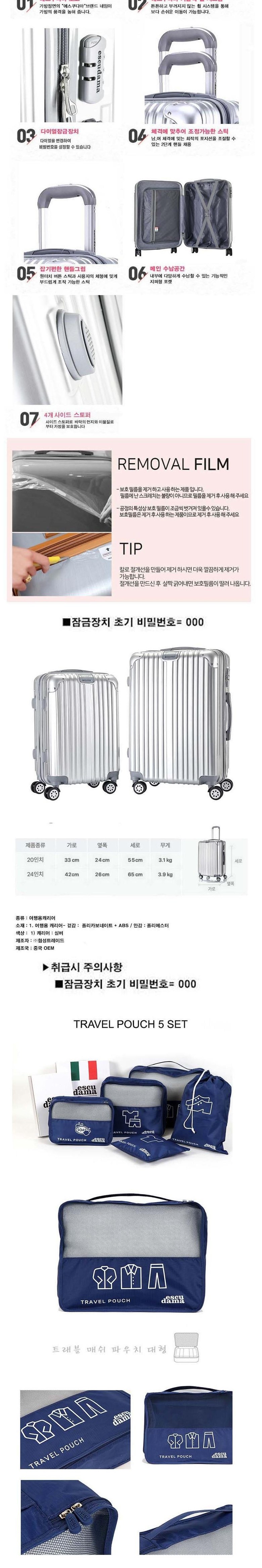 필수 표기정보 종류 여행용캐리어 소재 ABS 하드케이스 색상 차콜 크기 20형: 33x23x48 (cm) 제조자(수입자) (주)앙뜨레 제조국 중국OEM 취급시 주의사항 컨텐츠 참조 품질보증기준 제품 이상 시…