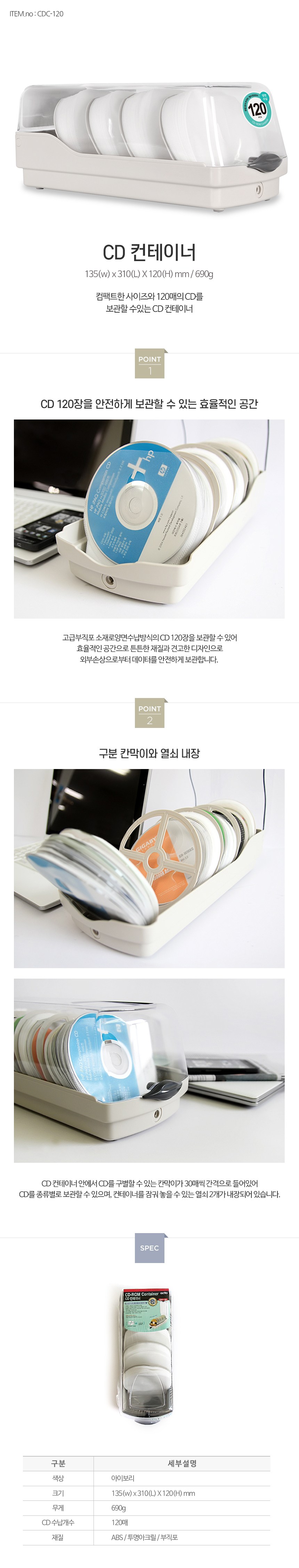| 주요 사양 | CD 수납용량 : 120매, 재질 : ABS/투명아크릴/부직포 |