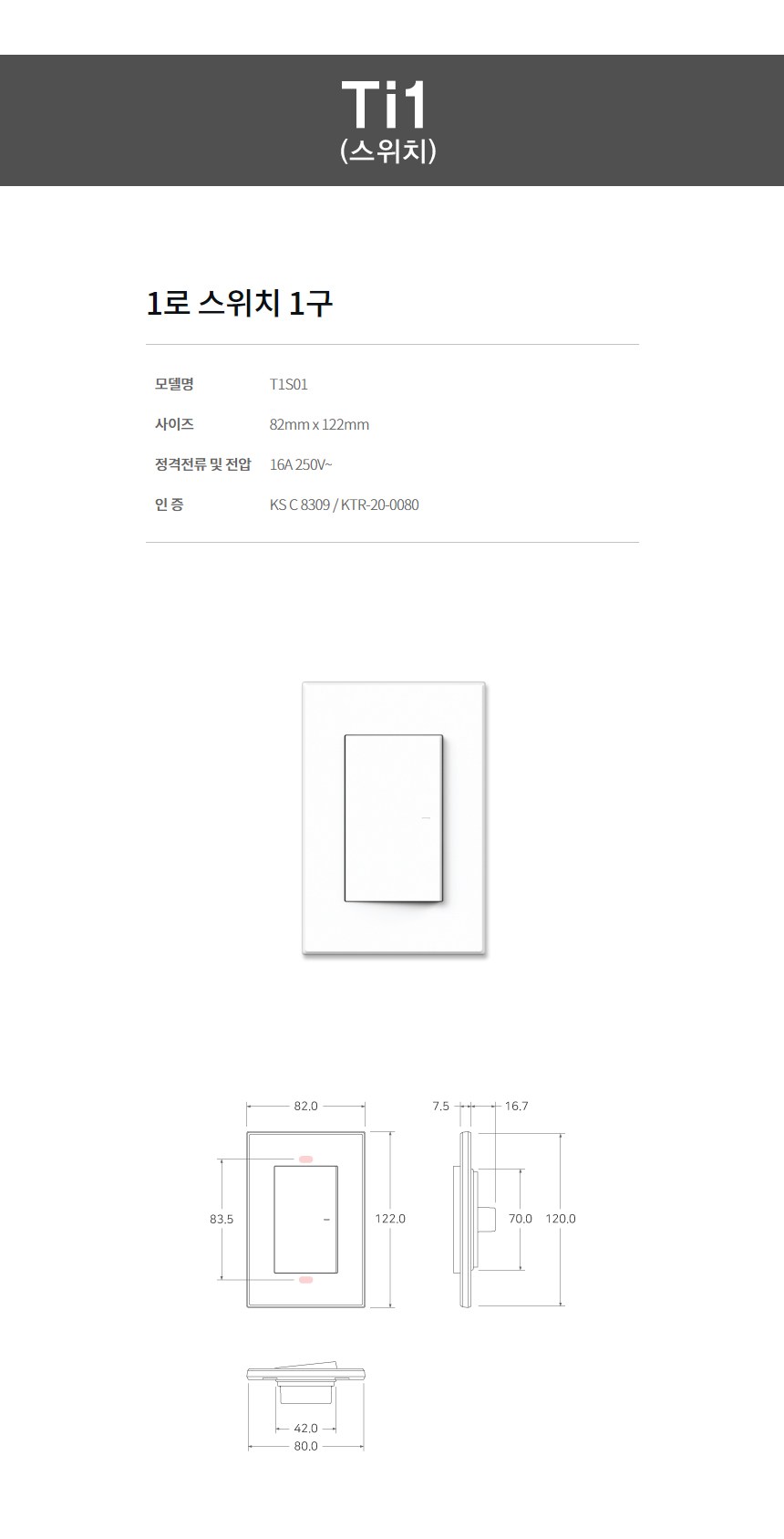 | 품명 및 모델명 | 원하 Ti1 1로 스위치 1구 |
