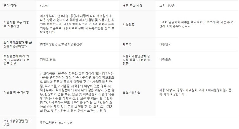 필수 표기정보 용량(중량) 상품 상세페이지 참조 제품 주요 사양 상품 상세페이지 참조 사용기한 또는 개봉 후 사용기간 상품 상세페이지 참조 사용방법 상품 상세페이지 참조 화장품제조업자…