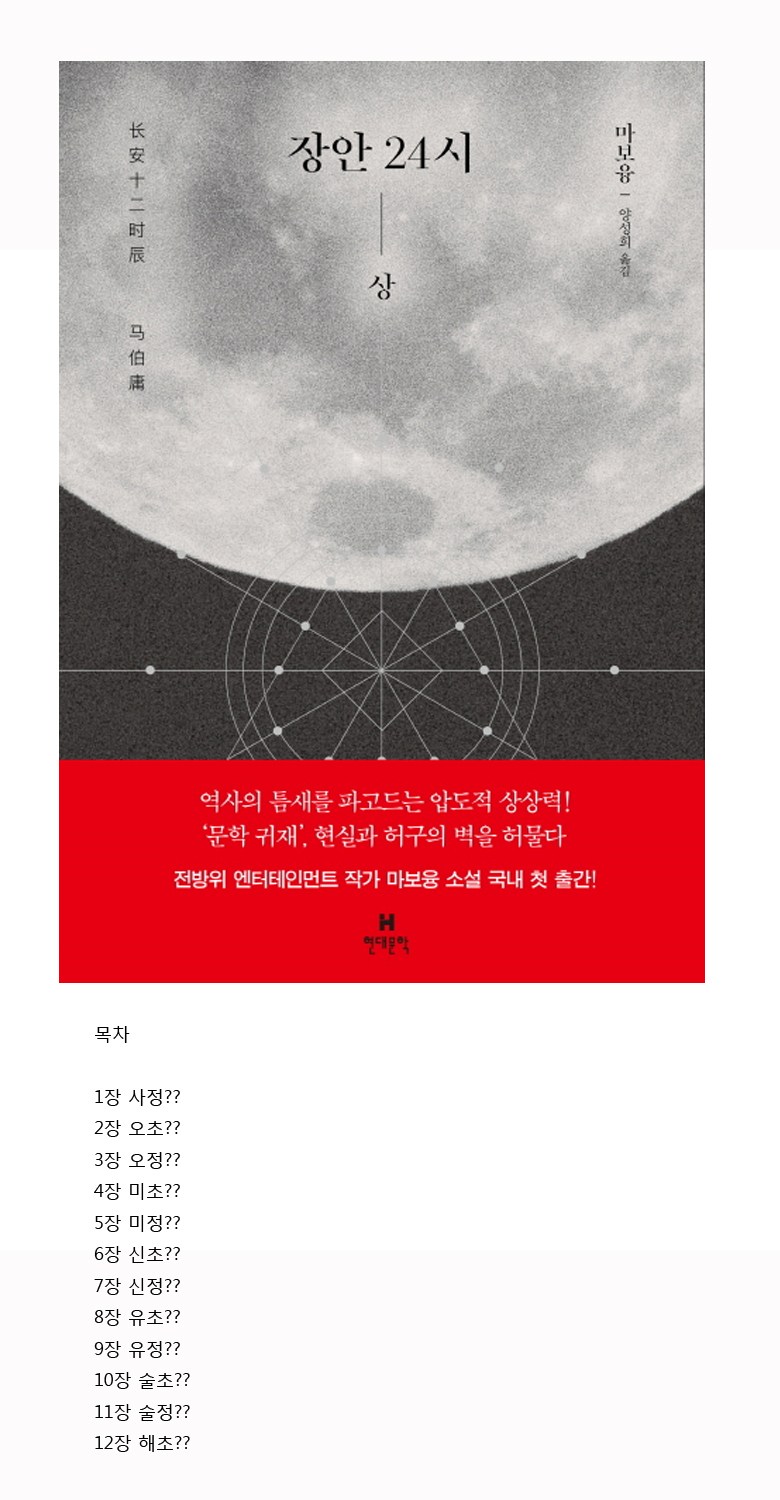 | 목차 또는 책소개(아동용 학습 교재의 경우 사용연령을 포함) | 중국 역사 소설의 계보를 잇는 작가로 꼽히는 작가 마보융의 소설 『장안 24시』 상권. 드라마 《장안십이시진》의 원작 소설로, 풀려난 사형수이자 전직 수사관 장소경을 주인공으로 24시간 동안 벌어지는 최악의 사건을 한 시간 단위, 총 24장의 구성으로 자세하게 다루고 있다. |