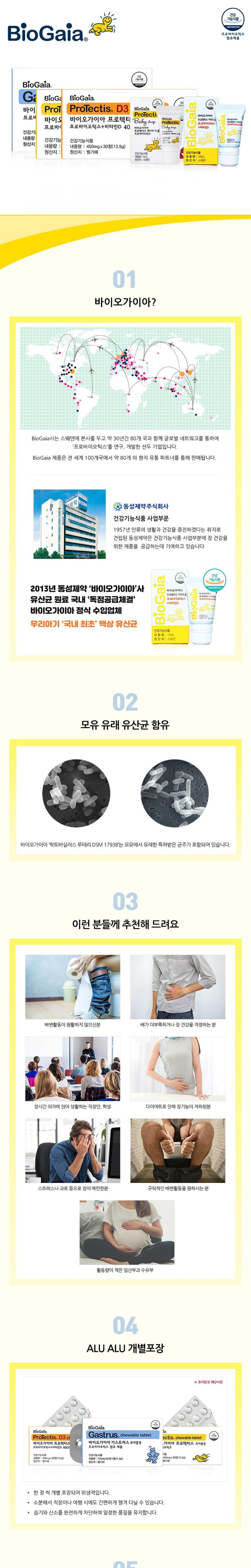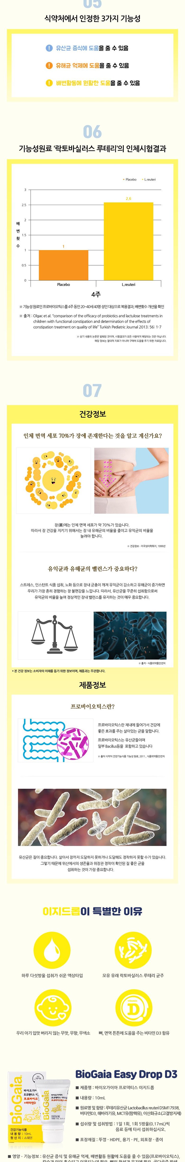 | 원재료명 및 함량 | 루테리 유산균 Lactobacillus reuteri DSM 17938, 비타민D3, 해바라기유, MCT유 (팜핵유), 이산화규소(고결방지제) |