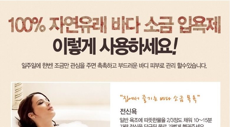 | 사용방법 | 일반 욕조에 따뜻한물을 2/3정도 채워 10~15분 가량 전신을 담근뒤 물로 가볍게 행궈주세요. |