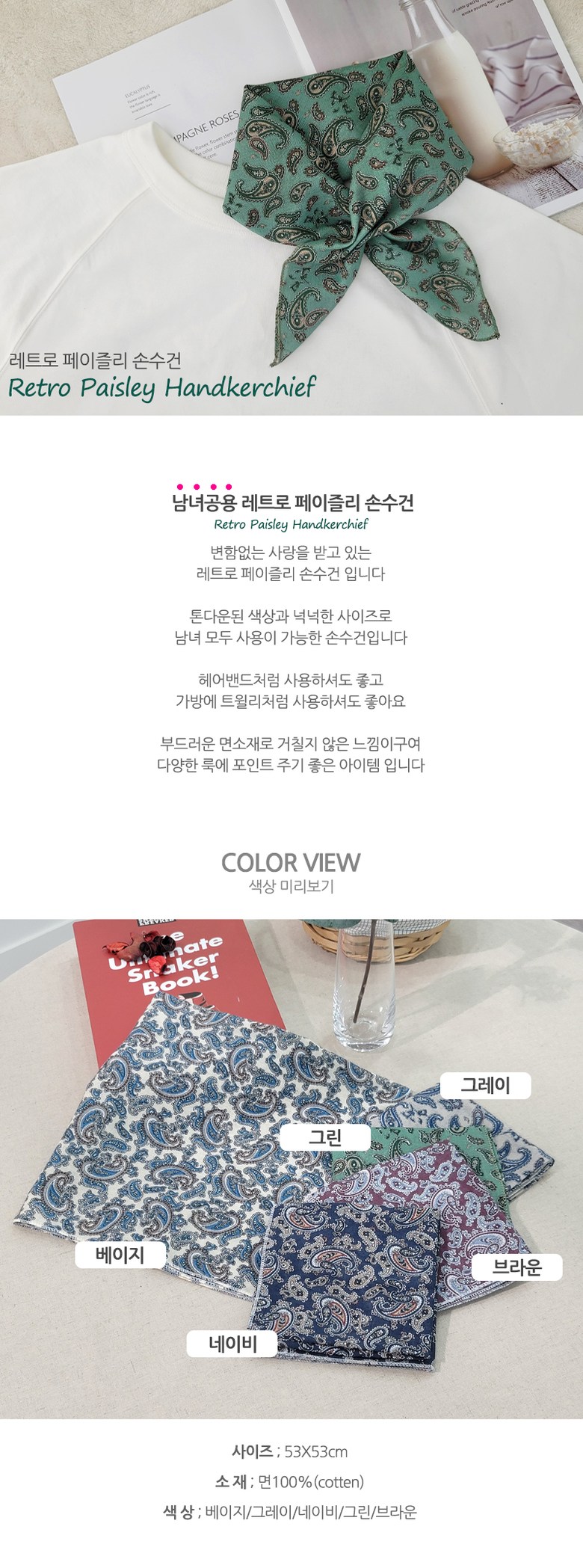 필수 표기정보 종류 손수건 소재 상세이미지 참조 치수 상세이미지 참조 제조자(수입자) 상세이미지 참조 제조국 상세이미지 참조 취급시 주의사항 ■ 오염 시 중성세제로 단독세탁하십시오. ■ 세탁방법은…