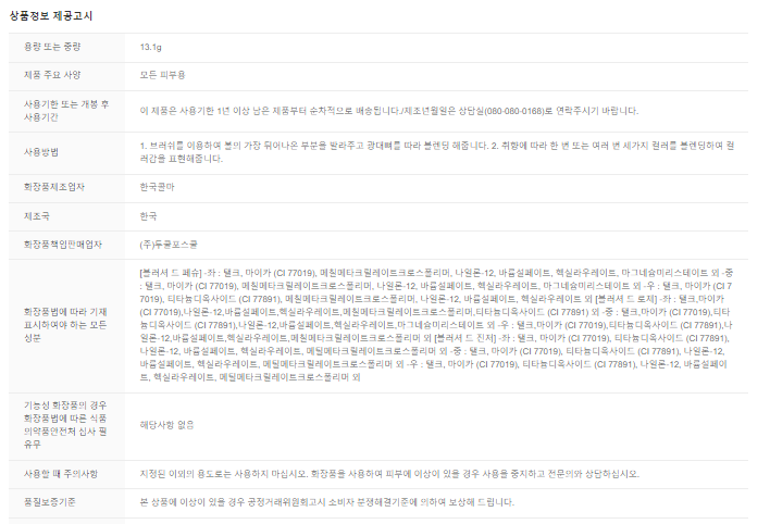필수 표기정보 용량(중량) 상세페이지 참조 제품 주요 사양 상세페이지 참조 사용기한 또는 개봉 후 사용기간 제품 입고시 마다 유효일은 상이 합니다 사용방법 상세페이지 참조 화장품제조업자…