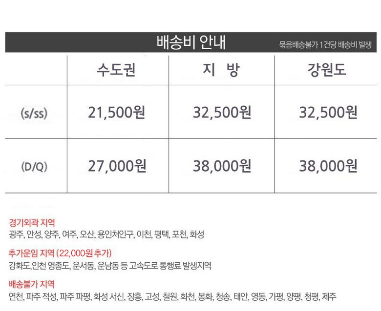 | 배송/설치비용 | 설치상품의경우 설치완료후 취소불가제작상품의경우 교환/반품불가 제품불량시 기사님떠나시기전에 확인된 건에한해 동일상품 무상교환 수도권 착불배송 지방 착불배송 단순변심 교환일경우 실제 배송비용이 청구될수 있습니다. |