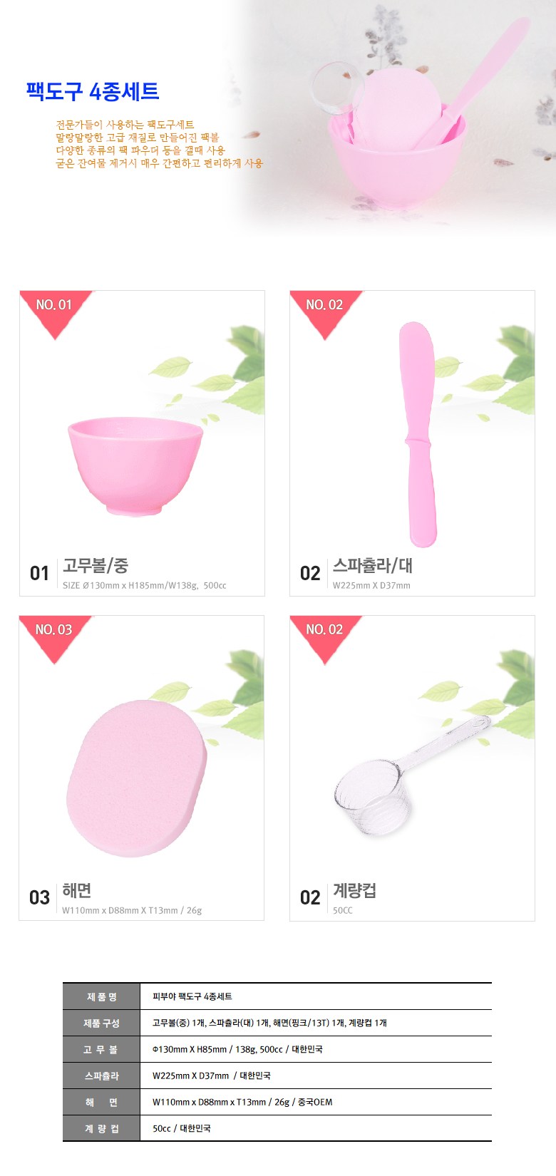 필수 표기정보 품명 및 모델명 팩도구4종세트 인증/허가 사항 해당사항없음 제조국(원산지) 상품 상세페이지 참조 제조자(수입자) 피부야 소비자상담 관련 전화번호 070-4038-8622 관련