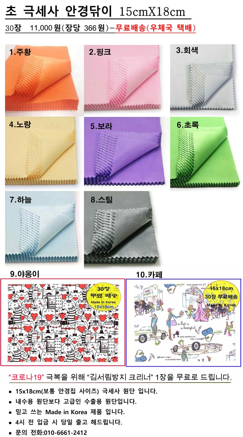 필수 표기정보 품명 및 모델명 샤닝 김서림 방지 안경닦이 인증/허가 사항 코팅제: CB20-07-1297 제조국(원산지) 중국 제조자(수입자) 본품 : Sha Ning Microfiber Maker Co.,LTD / 주식회사…