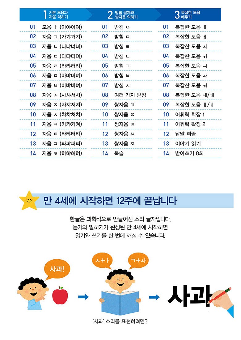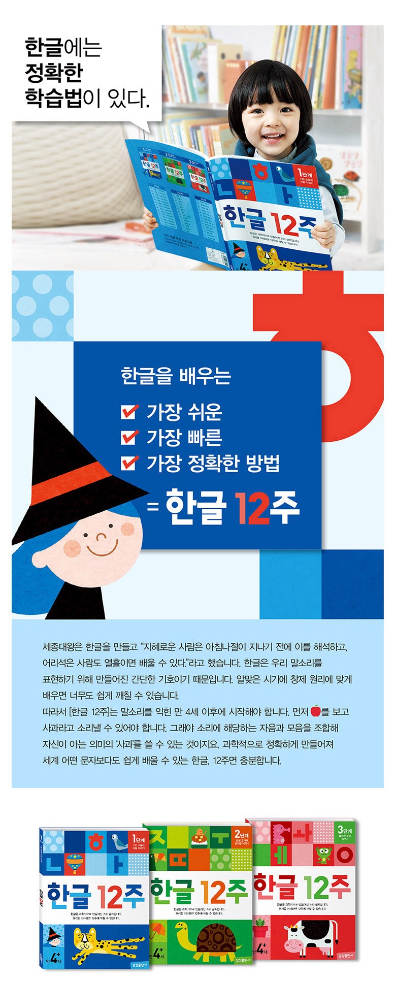 | 목차 또는 책소개(아동용 학습 교재의 경우 사용연령을 포함) | 세종대왕은 한글을 만들고 “지혜로운 사람은 아침나절이 지나기 전이 이를 해석하고, 어리석은 사람도 열흘이면 배울 수 있다.”라고 했습니다. 한글은 우리 말소리를 표현하기 위해 만들어진 간단한 기호이기 때문입니다. 알맞은 시기에 창제 원리에 맞게 배우면 너무도 쉽게 깨칠 수 있습니다. 따라서 [한글12주]는 말소리를 익힌 만 4세 이후에 시작해야 합니다. 먼저 사과를 보고 사과라고 소리낼 수 있어야 합니다. 그래야 소리에 해당하는 자음과 모음을 조합해 자신이 아는 의미의 ‘사과’를 쓸 수 있는 것이지요. 과학적으로 정확하게 만들어져 세계 어떤 문자보다도 쉽게 배울 수 있는 한글, 12주면 충분합니다. |