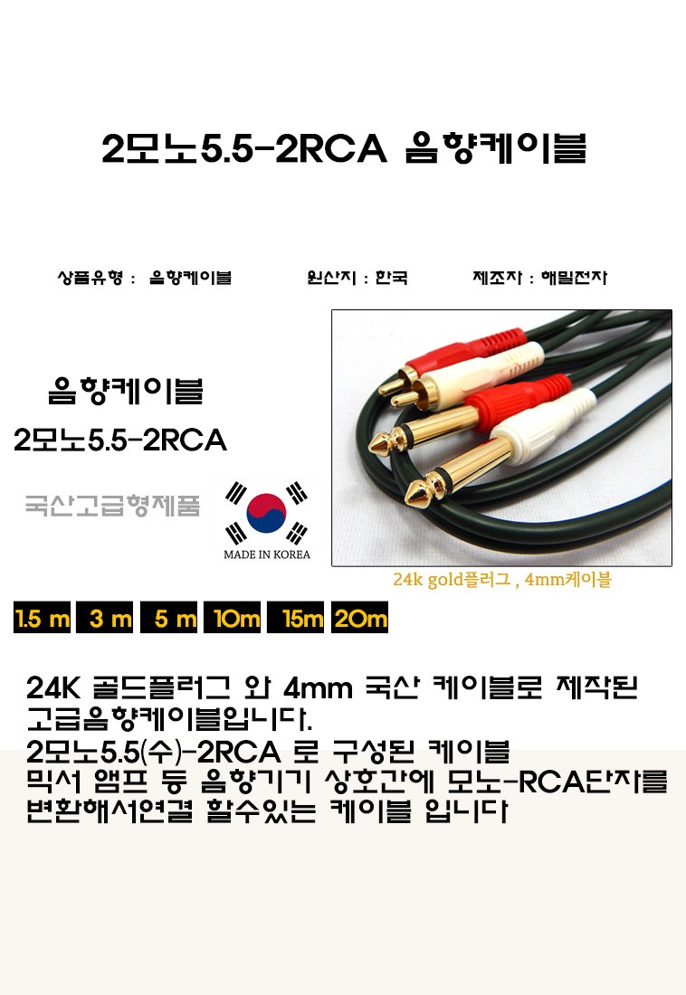 | 품명 및 모델명 | 국산 고급형 오이도케이블 RCA 모노 55잭 앰프 스피커 연결선 ML08 5.5모노2-2RCA 1.5M |