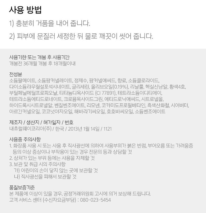 | 화장품제조업자 및 화장품책임판매업자 | 내츄럴웨이코리아(주)/(주)아모레퍼시픽 |