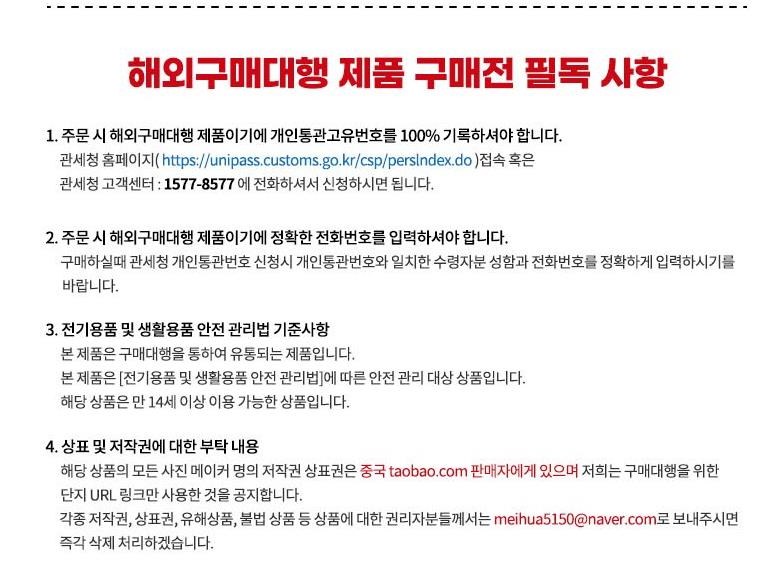 필수 표기정보 품명 및 모델명 상세페이지 참조 인증/허가 사항 상세페이지 참조 제조국(원산지) 상세페이지 참조 제조자(수입자) 상세페이지 참조 소비자상담 관련 전화번호 상세페이지 참조 관련