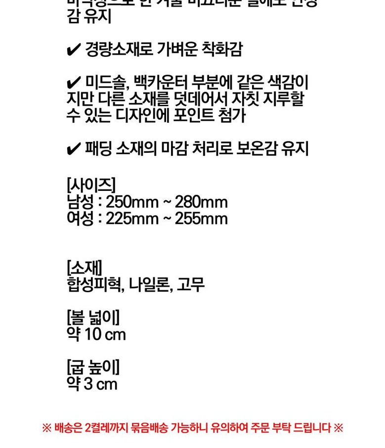 필수 표기정보 제품의 주소재(운동화인 경우에는 겉감,안감을 구분하여 표시) EVA,인조양모 색상 블루,브라운,핑크,레드,베이지 치수 235~245mm , 265~275mm 제조자(수입자) 송강 제조국 중국 취급시 주의사항 상세설명 참조 품질보증기준 공정거래위원회…