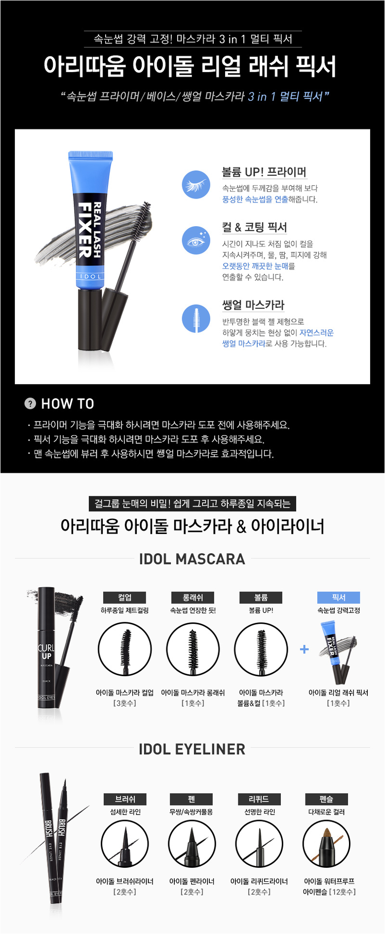 | 사용방법 | 프라이머 기능을 극대화 하시려면 마스카라 도포 전에 사용해주세요. 픽서 기능을 극대화 하시려면 마스카라 도포 후 사용해 주세요. 맨 속눈썹에 뷰러 후 사용하시면 썡얼 마스카라로 효과적입니다. |