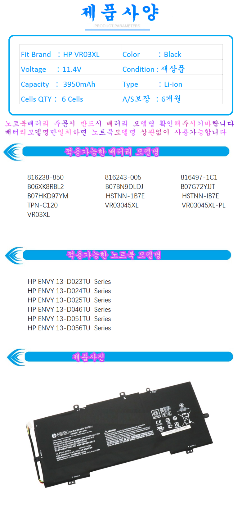 태그: 13, 816243-005, ENVY, HP, HP노트북배터리, HSTNN-IB7E, TPC-C120, VR03XL