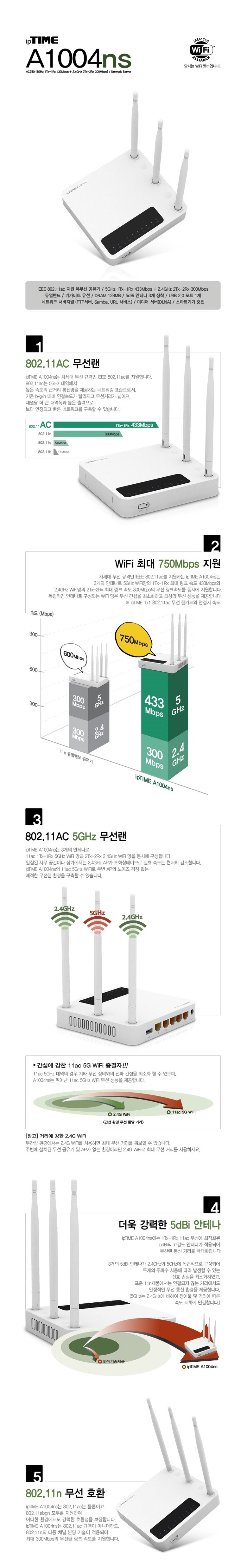 | 주요 사양 | 11ac(5Ghz) 1Tx-1Rx 433Mbps급, 11n(2.4Ghz) 2Tx-2Rx 300Mbps급 동시 지원, 4LAN 기가비트 포트 유무선공유기 / 5dbi, 3ANT / USB포트, 간이NAS 지원 |