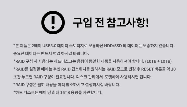 | 주요 사양 | USB3.0 3.5/2.5인치 HDD SSD 장착가능 |
